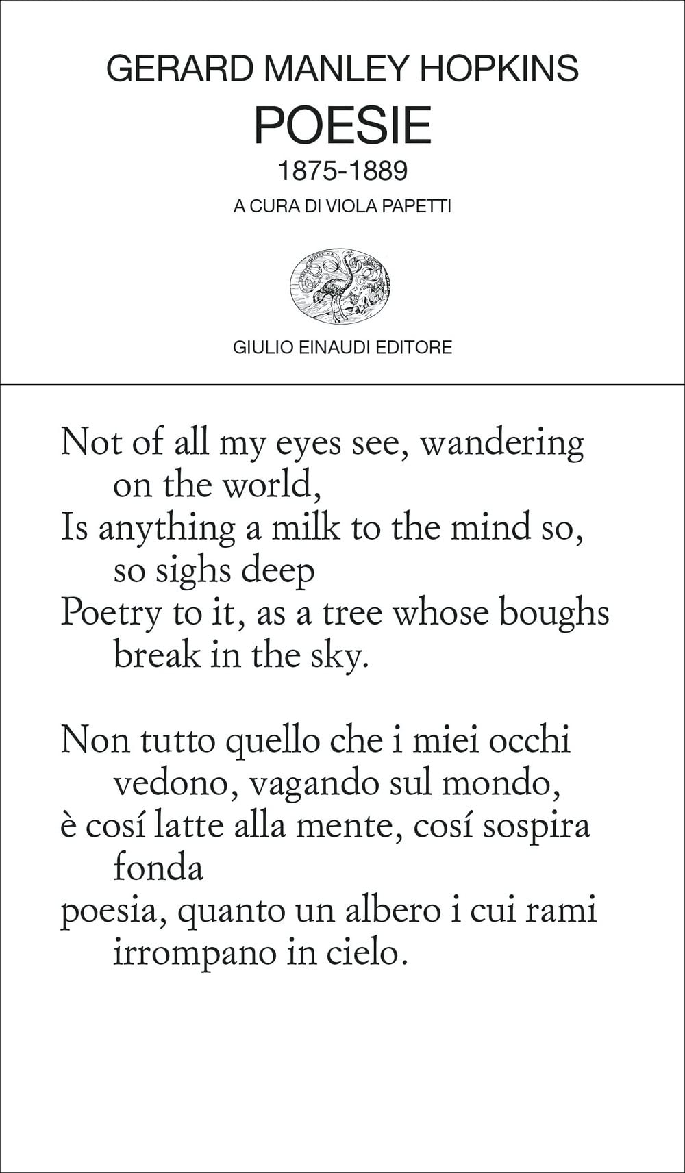 Gerard Manley Hopkins (Stratfort 1844 – Dublino 1889) studiò a Oxford e fu sacerdote cattolico a Londra, Liverpool e Glasgow. Fu poi inviato all’Università di Dublino dai suoi superiori: da buon gesuita obbedì alle disposizioni e rimase a Dublino fino alla morte, ma rimpianse sempre le amicizie lasciate in Inghilterra. E fu proprio un amico dei tempi di Oxford, Robert Bridges, «poeta laureato» da Giorgio V, a raccogliere le poesie di Hopkins, tutte inedite, e a pubblicarle nel 1914. Einaudi ha pubblicato Poesie. 1875-1889 (2022).