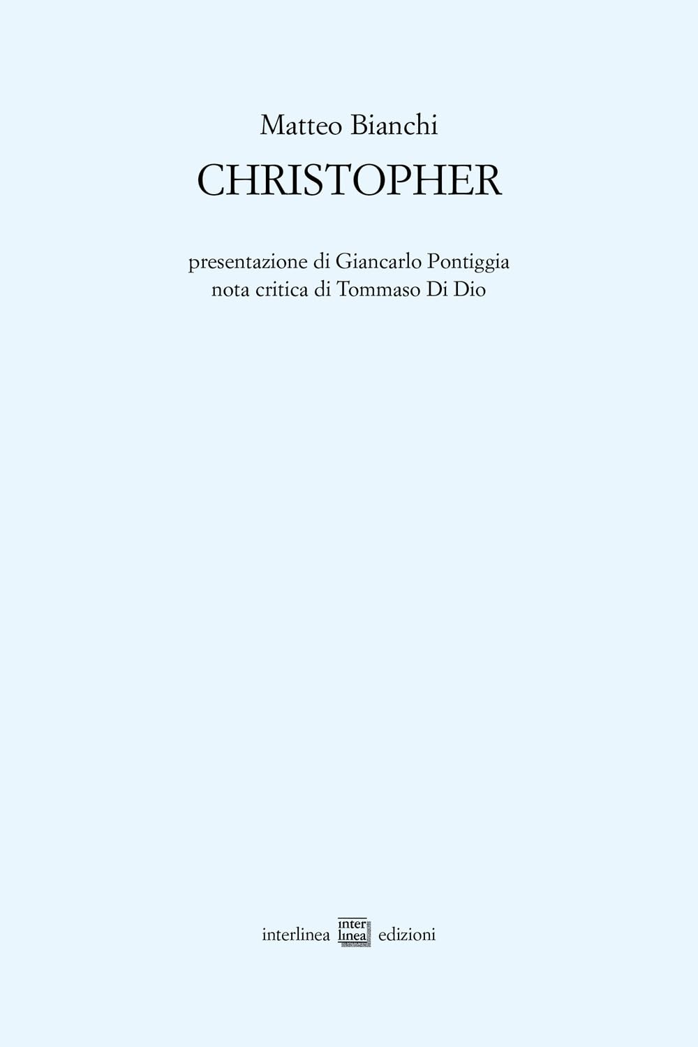 Christopher è una raccolta poetica ibrida, dolente e insieme precisa, concepita intorno a tre figure portanti: Christopher Channing (artista queer, attore teatrale, creatura notturna, in bilico tra il nudo e la maschera, tra la lingua inglese e la malinconia parisienne), Roberto Pazzi (il maestro, l’intellettuale esemplare, l’ultimo alfiere di una cultura che rifiuta il consumo e la finzione) e Napoleone Bonaparte (non il generale di Austerlitz, bensì il vinto dell’Elba, il nostalgico rifugiato nella propria disfatta).